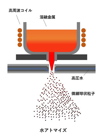 | 水アトマイズ法 | 高周波 | 有 | 金属融点+150~200°c | 高い | 水 | △ | △ | × | ◎ |