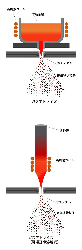 | 製粉方法と条件 | 製粉方法 | 水アトマイズ法 | ガスアトマイズ法 (電磁誘導溶解式) | ディスクアトマイズ法 | プラズマアトマイズ法 | PREP法 (プラズマ回転電極法) |