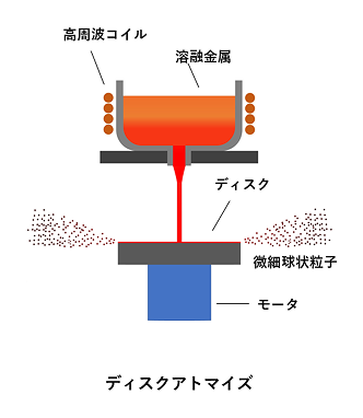 溶解した金属溶湯を回転する円盤(ディスク)に供給することで、円盤の遠心力で粉末化する製粉プロセスです。 上記の2つのプロセスとは異なり、遠心力によって粉末化・微細化することから、形状は球形に近く、またサテライト粉末の付着もほとんど見られません。但し、円盤の耐熱性等の課題から、現時点では主に低融点材料の製粉に限定されており、特にアルミ合金や銅などの低融点材料では金属積層造形用粉末として活用されています。