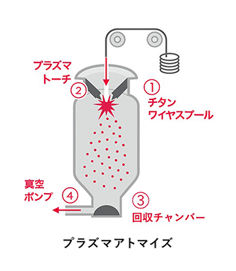 金属ワイヤーにプラズマを噴射して溶融・粉末化するプロセスです。球形度が高く、微細なサテライト粉末の付着も少ないことから、流動性にも優れています。プラズマガスとしてアルゴンが用いられますが、ガスアトマイズ法に比べて低圧力のため、ガスの巻き込みによる粉末内部のガス欠陥も低減されています。原料としてはワイヤー状(直径20mm以下)にして供給する必要があるため、溶解後にインゴットを鍛造、伸線加工等が必要であり、成形が難しい特殊な合金は製粉できない場合があります。